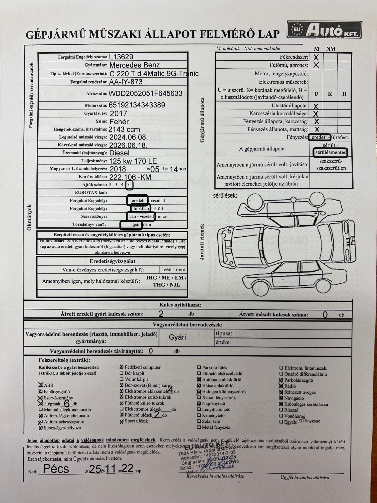 Cégünk az EU Autó Kft. azonnali készpénz fizetéssel megvásárolja használt gépjárművét 2015-ös évjárattól, lehet akár banki hitellel terhelt illetve enyhén sérült is! Részletek és azonnali értékbecslés a saját weboldalunkon! w w w euautokft huFrsz: AAIY-873,alvázszám:WDD2052051F645633,gyártási év:2017